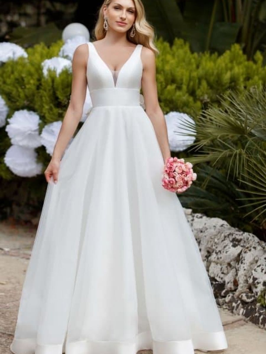 Ein V-Ausschnitt-Brautkleid zeigt mehr Haut und verlängert optisch den Oberkörper. Ist optimal geeignet für Frauen mit Rundungen und/oder mit mehr Brust! Der gesamte Körper wird durch den V-Ausschnitt gestreckt und die Erscheinung wird somit schmäler. Dieser Ausschnitt ist für die Braut. Mit Brust oder für die Braut mit Kurven geeignet!