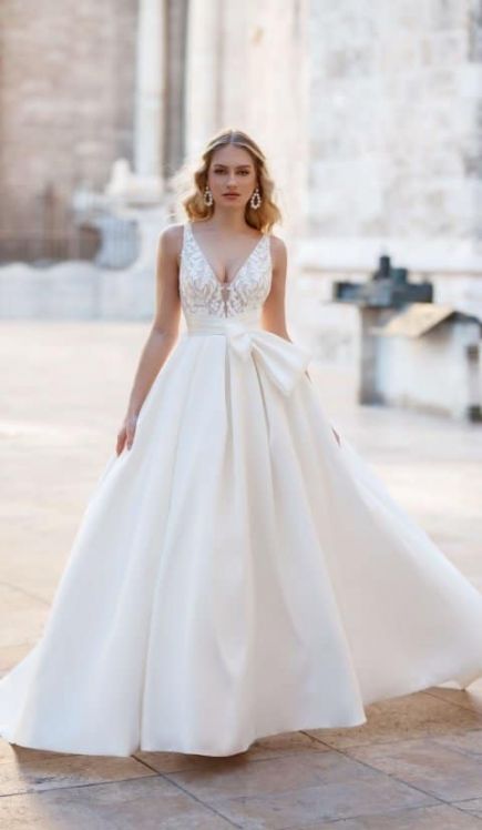Vorrätig sind Kleider und Brautmode von Größe EU 36 bis Größe EU 46.